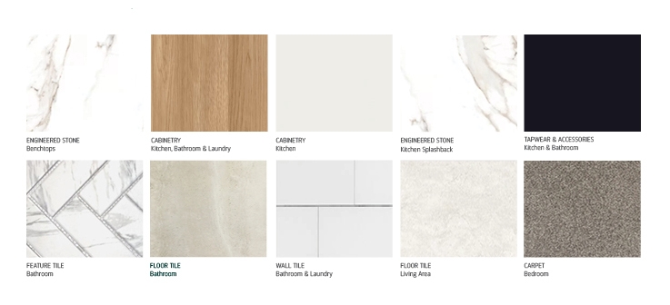 This elegant scheme is pulled together with a touch of brushed gold in the tapware and accessories, elevating the colour scheme to luxe and providing that golden sparkle.
