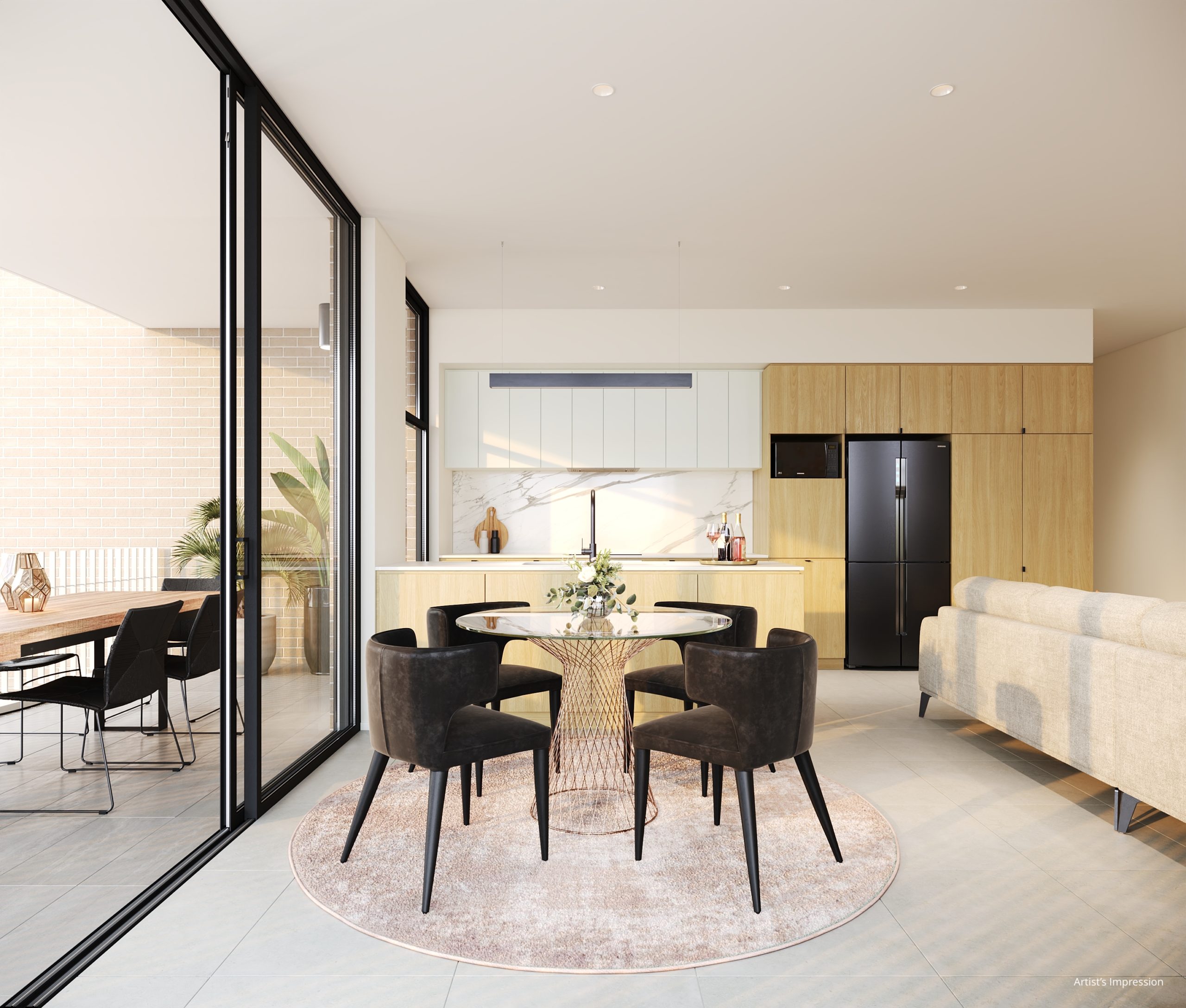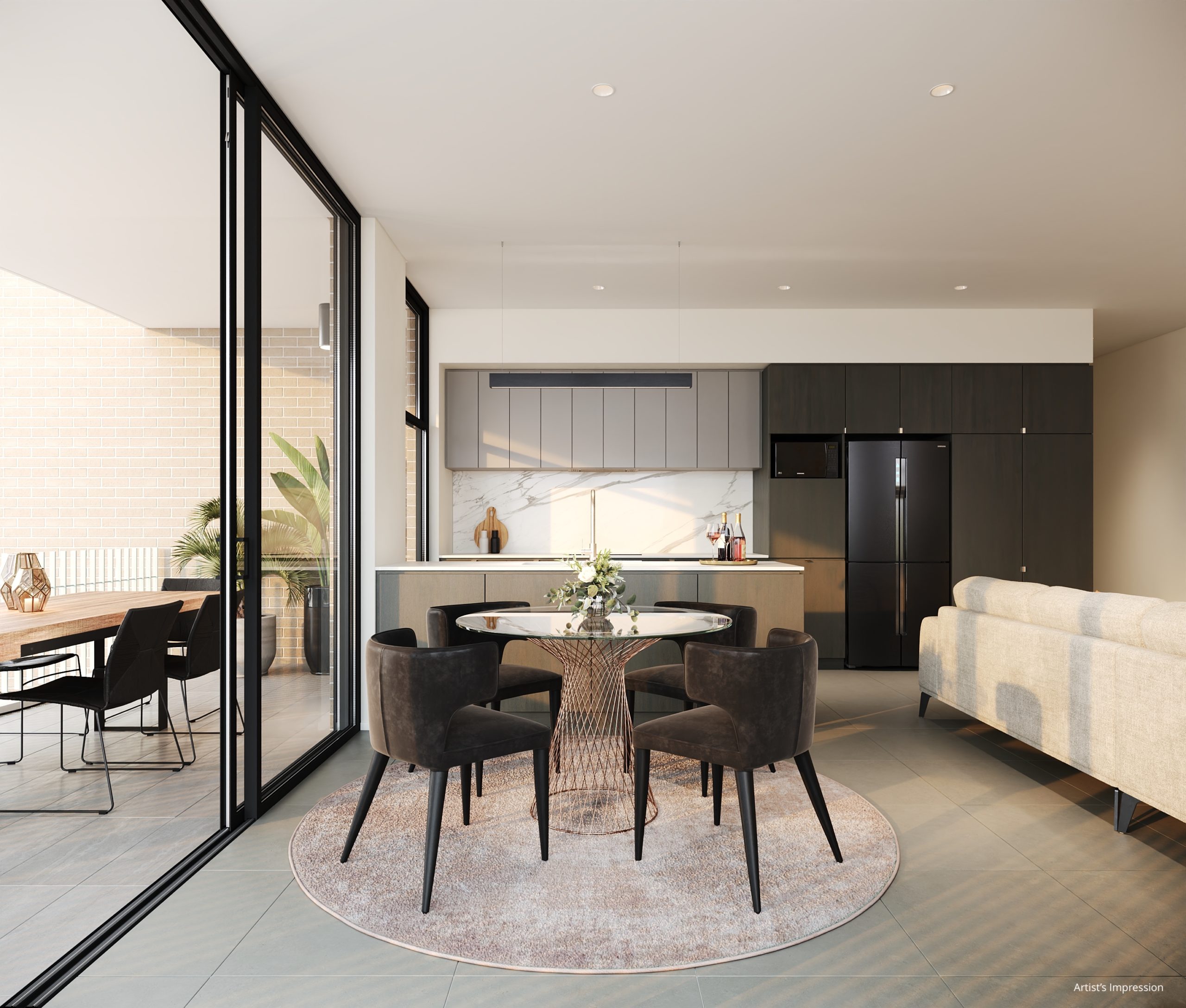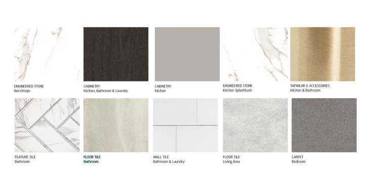 Each apartment features premium engineered stone benchtops, marble look stone splashback, feature pendant lighting, marble look herringbone bathroom feature tiling, brushed gold and matt black finishes, plush carpets with 600 x 600 tiles in the living areas.