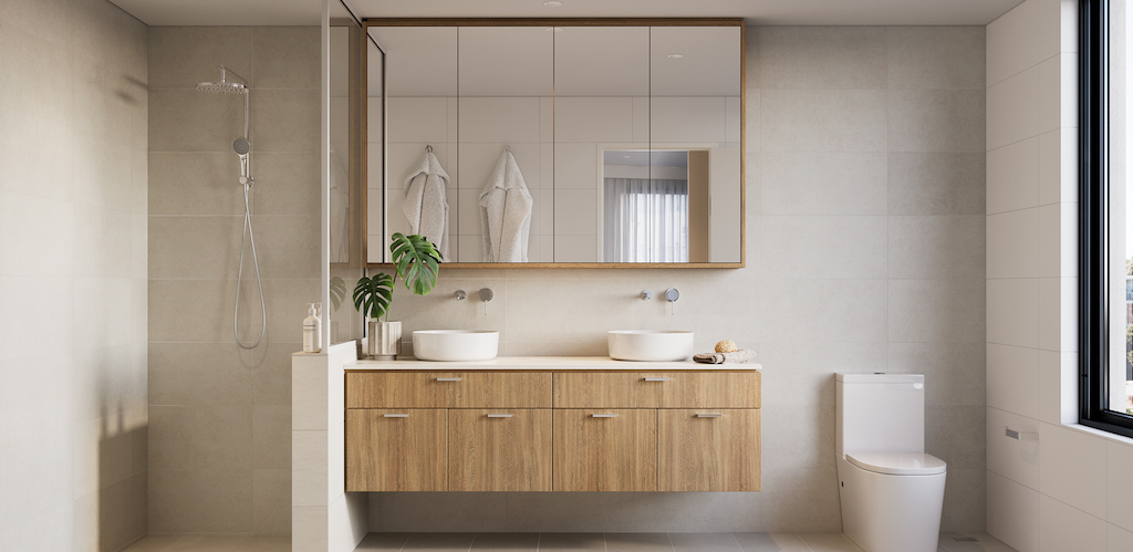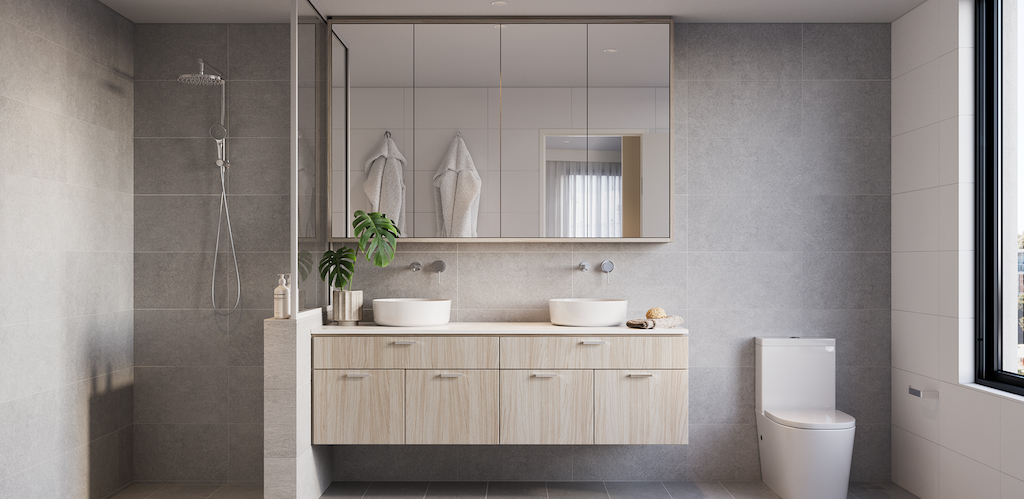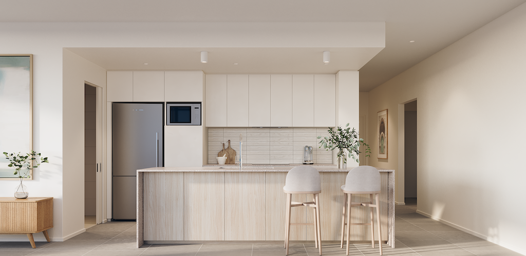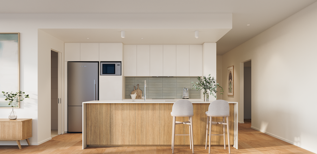 Each apartment features premium benchtops, glossy tile kitchen splashback, quality wall to floor tiling in all wet areas, plush carpets, and either your choice of engineered wood flooring or 600 x 600 tiles in the living areas.
