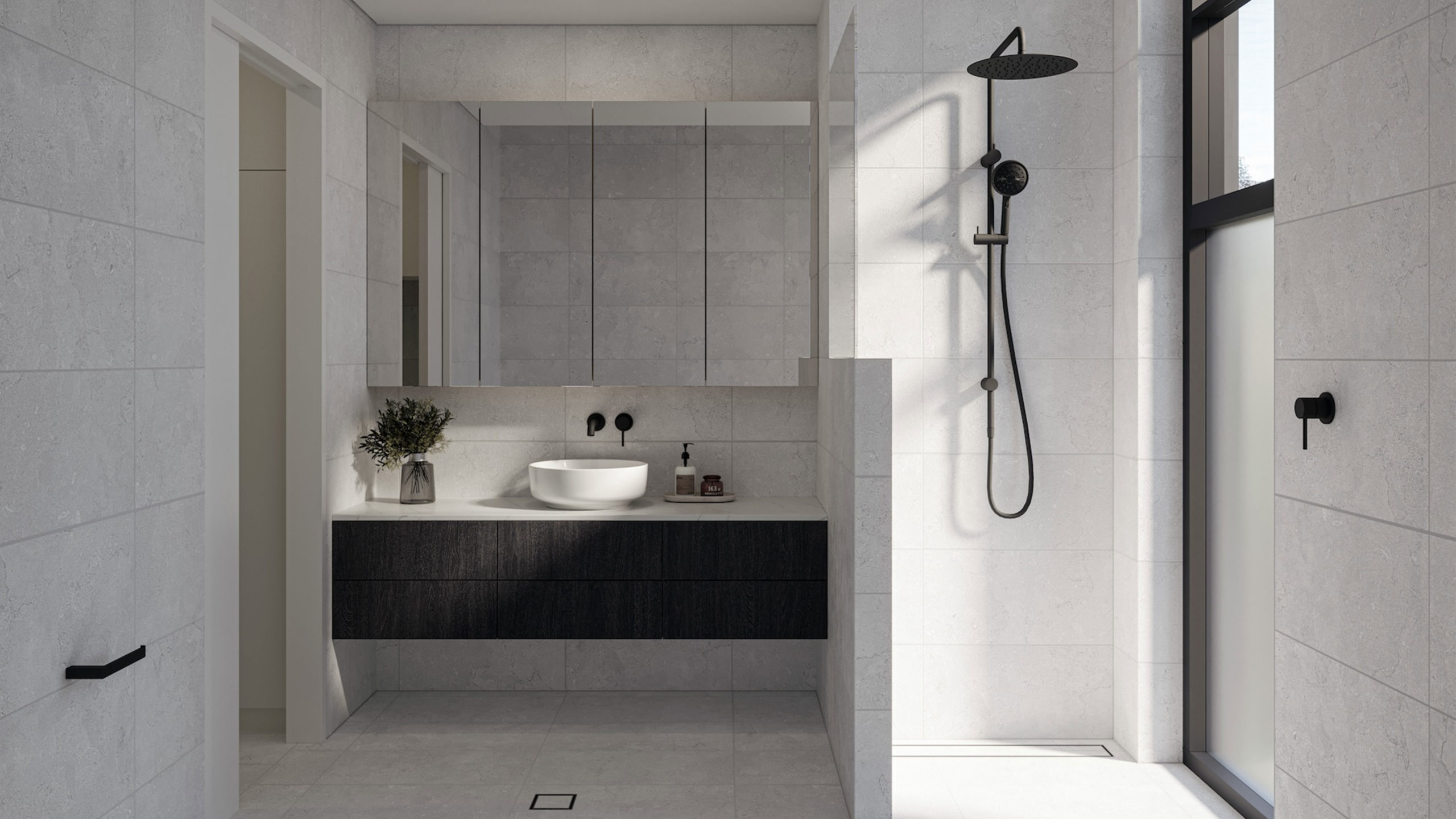 Charcoal cabinetry in the kitchen and bathrooms is contrasted with light misty tiles, and complemented by Driftwood timber flooring.